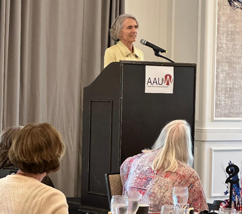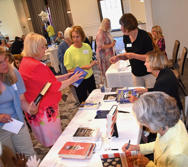 A good time was had by all at the branch’s annual fundraiser for re-entry women’s scholarships. Our two authors, Dr Sondra Bonura and Linda Moore, were animated, intelligent, and humorous and the time seemed to go by too quickly. The beautiful country club surroundings, good food, and upbeat but relaxed atmosphere encouraged our 106 members and guests to thoroughly enjoy themselves. As for fundraising, the numbers are not all in yet, but the bidding and sales were brisk, and the branch can once again look forward to awarding generous scholarships for the Fall semester.